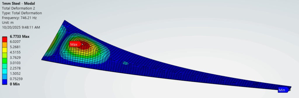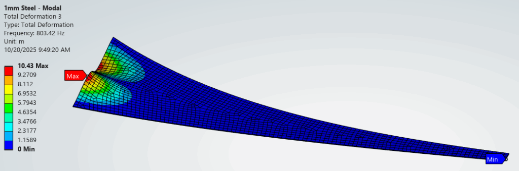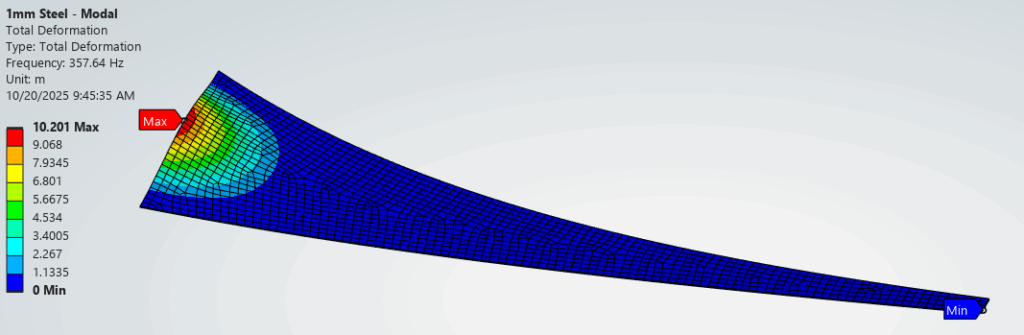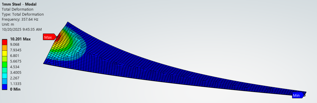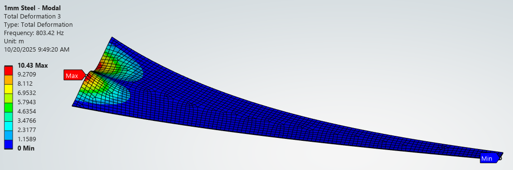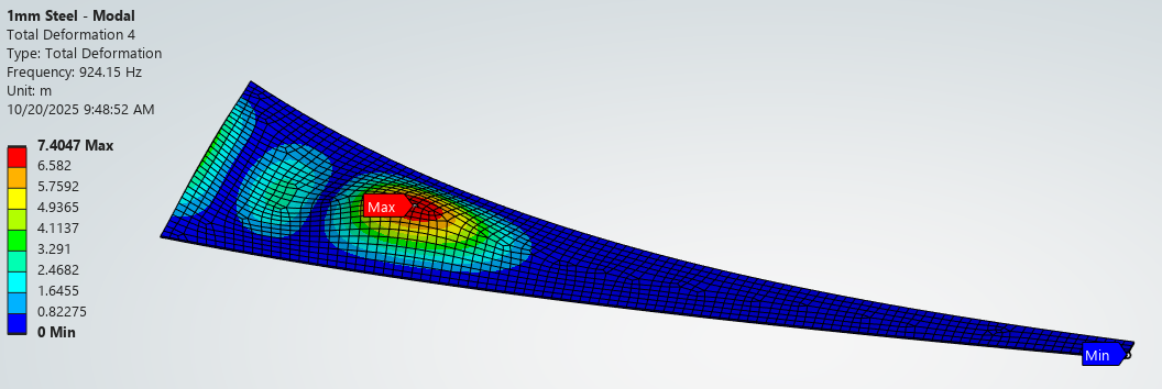 The modal simulation output and first four deflected shapes for the Steel – Baseline config is shown below. The first mode, lowest frequency, is located at the mouth and higher modes involve material farther away.