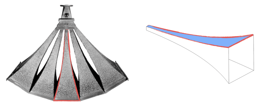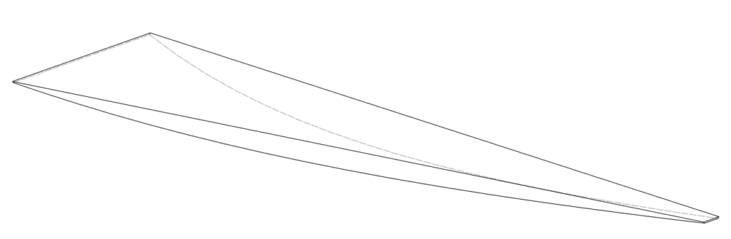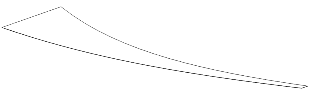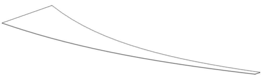 The image below shows a typical “wedge” for this study. Three ends are fixed as shown. A static deflection simulation will be performed by applying pressure onto the entire interior wall. A modal simulation will be performed with the same constraints minus pressure.