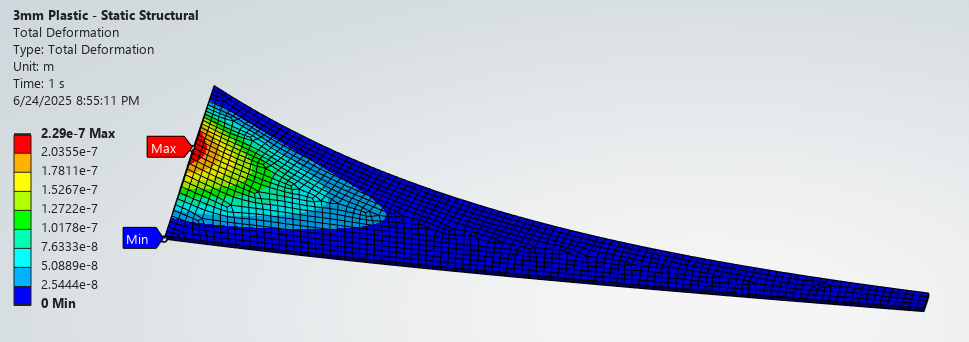 The weakest point is at the mouth opening for most configs. This is expected due to the large span. PETG configs are much weaker than Steel but adding cross section helps greatly. PETG configs with metal stiffeners are able to further reduce maximum deflection by an order of magnitude.