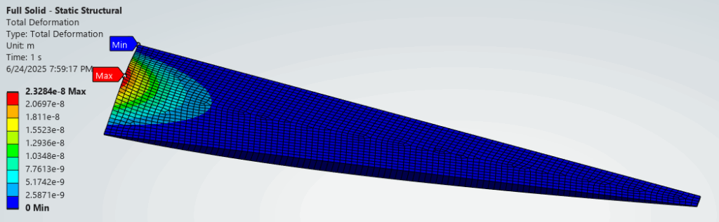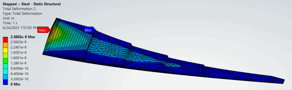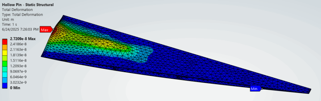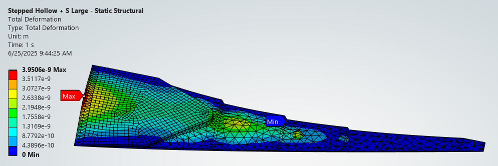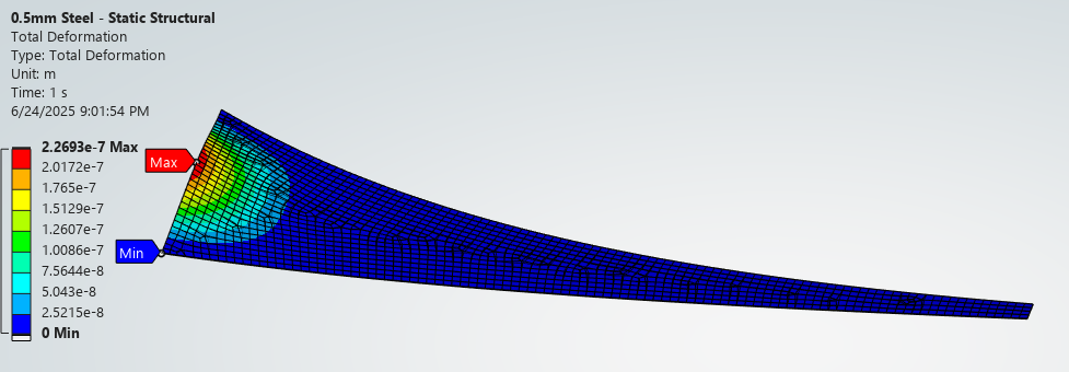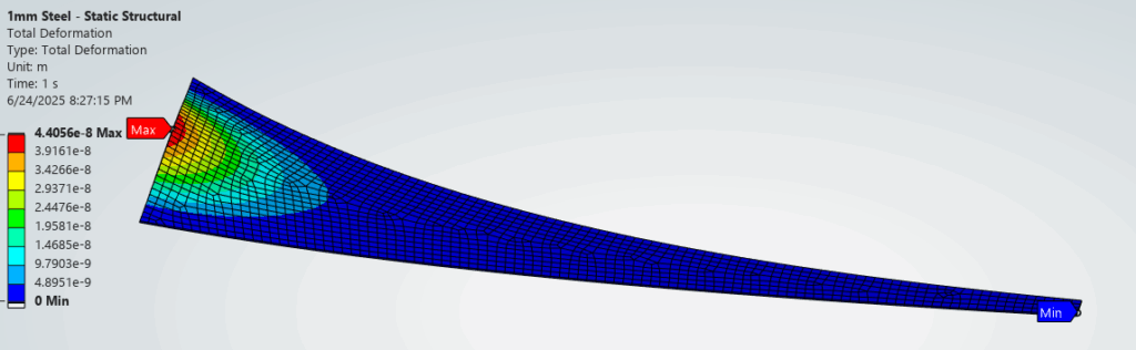 The resultant deflection from the 1Pa pressure is minuscule and well within the linear region. As an example, the Steel – Baseline config shows a maximum deflection of 4.4×10-8m or 44 nanometer. We can expect the displacement to increase for higher operational pressure but it should still be within the linear region.
